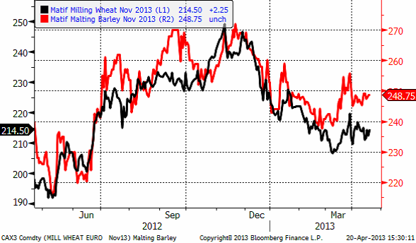Vi ser ju faktiskt något av samma sak vad gäller maltkornet på Matif, som drar ifrån höstvetet. Strategie Grains fortsätter att justera ned sitt estimat för EU:s veteproduktion 2013/14 med ca 500 000 ton till 130 mt, vilket är den fjärde nedjusteringen i rad. Revideringen beror främst på en minskning av produktionen i Storbritannien med 330 000 ton efter förra årets katastrofala höstsådd samt lägre areal i Danmark och Spanien som resulterar i en minskning med 200 000 ton. Det blöta och kalla vädret i år har dessutom försenat höstgrödornas utveckling samtidigt som det har hämmat sådden av vårgrödor.
