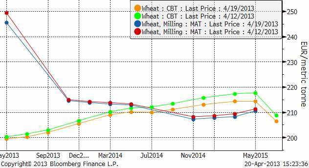 Estimatet för EU:s produktion plus Kroatiens, som ansluter sig och blir EU:s 28:e medlem i juli, uppgår till 131.1 mt, vilket är en nedjustering från 131.6 mt förra månaden. Men temperaturen i norra Europa, med centrum i Tyskland, har den senaste veckan legat över det normala.