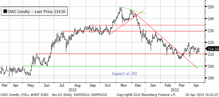 Priset på november (2013) har hållit sig över 210 euro, som nu återigen fungerar som ett tekniskt stöd. Frågan är om priset ska bryta uppåt och testa 230.
