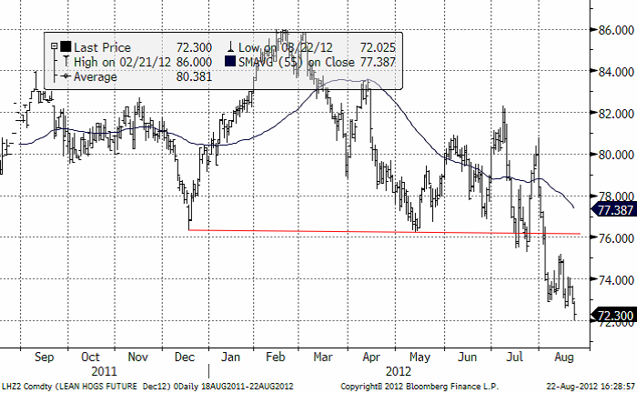 Genombrottet av stödet är nu bekräftat och priset kan fortsätta nedåt. Vi tror att nya kontraktslägsta väntar kring hörnet. Live Cattle föll igår till den lägsta noteringen på två veckor. Slakterier processade 259,000 djur de första två dagarna den här veckan. Det är 3.6% mer än förra veckan och 1.6% mer än för ett år sedan, enligt data från USDA. Det är de höga foderpriserna som ökar slakten och minskar hjordarna. Vi ska komma ihåg att priset på majs har stigit med 63% sedan den 15 juni. Juli månad är den varmaste någonsin i USA, sedan man började mäta.