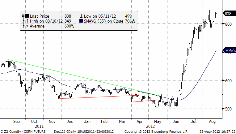 Triangelformationen är bruten på uppsidan vilket bekräftar den uppåtgående trenden. Vi kan sätta en teoretisk målkurs till 1879 cent / bu, så det finns enligt textboken gott om utrymme för en ordenlig hausse. Om marknaden faller tillbaka ner i triangeln bör man dock gå ur långa positioner.
