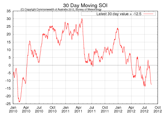 Southern Oscillation Index har fortsatt att sjunka och ligger nu på -12.5. Ett värde under -8 indikerar El Niño-förhållanden. Vi ser tecken på detta då nederbörden i östra Australien är torrare än normalt, medan den västra är fuktig. Vi ser att det har regnat rikligt över Argentina. Jordbruksmeteorologer vid Texas A&M Univerity i College Station har också diskonterat ett svalt och fuktigt Texas-klimat. Texas är svårt plågat av torka nu och får ses som indikator på vad som händer med marknaderna på kött nu. Från Vietnam, världens största producent av robusta kaffe, rapporterar dålig tillväxt på grund av för lite nederbörd (små bönor). Allt detta hänger ihop med ett El Niño. Vi kan dessutom förvänta oss att det blir torrt i de fattiga och konfliktfyllda delarna av västra Afrika – och blött i Europa. Än så länge ser det dock inte ut att bli en allvarlig släng av El Niño.