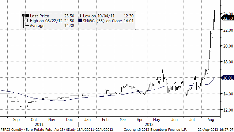 Potatishaussen fortsatte den senaste veckan. Uppgången sedan förra veckans veckobrev är 14%. Bakgrunden är att den tidigast skördade potatisen i Beneluxländerna inte alls visade samma skörd man väntat sig. Se tabellen i slutet av veckobrevet för terminspriserna för nästa års skörd.