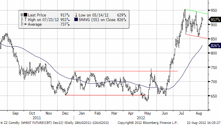 Majspriset har avslutat en teknisk så kallad ”flagga” och torde fortsätta uppåt. Den tekniska analysen visar att marknaden snart borde ta ut den tidigare toppen (vilket bekräftas om 931¾ bryts). Stödet på 774 höll vid den senaste nedgången, vilket stödjer oss i att nedgången var en rekyl och inte en mer övertygande nedgång. Köparna är alltså tillbaka i förarsätet och det borde bli en ny körare uppåt. Det gamla målet på 870 kan vara värt att komma ihåg.