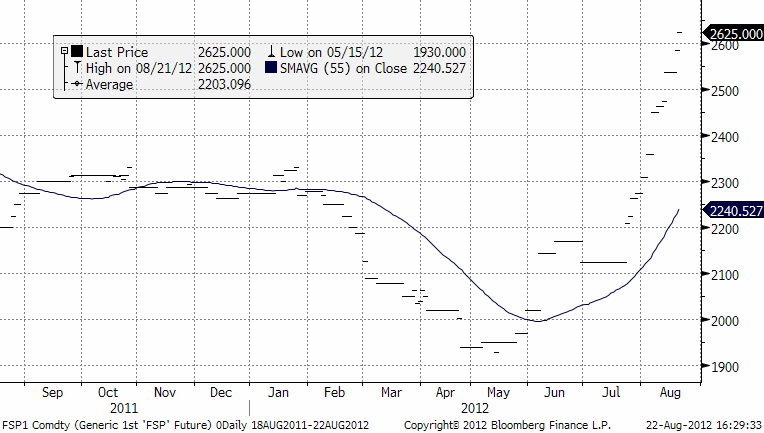 På den amerikanska börsen har priset också stigit. EUREX som representerar marknaden i Europa har börjat bli allt mer med världsmarknadens pris, representerat av terminerna i Chicago.