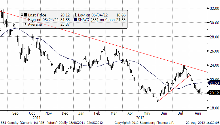 Priset på socker har, såsom vi har förutspått, fortsatt att sjunka. Vi skrev för en vecka sedan att 20 cent är en psykologiskt viktig nivå. Marknaden tvekade lite där, men bröt sedan stödet. Det gör att vi tror att priset kommer att fortsätta ner mot 19 cent i första hand.