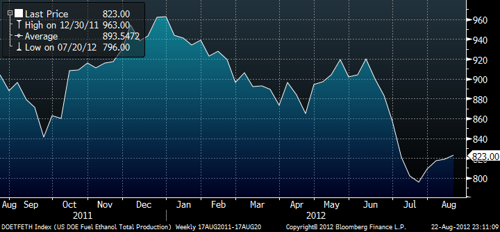 Indiana är den femte största sojaböns- och majsproducerande delstaten i USA. Torka påverkar nu 87% av amerikansk majsproduktion och 85% av sojaodlingen. Etanolproduktionen visar inga tecken på avta. Nedan ser vi ett diagram över daglig produktion i 1000 x fat per dag. Statistiken är veckovis och publiceras av US DOE på onsdagar. Vi ser alltså en ökning till 823,000 fat / dag den senaste veckan.