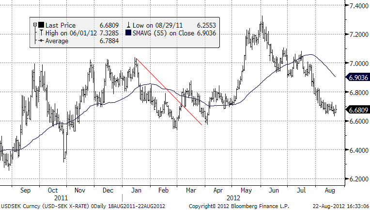 EURSEK svarar på ett starkt tekniskt stöd. Vi tror på sidledes rörelse den närmaste veckan. Den långsiktiga trenden är alltjämt nedåtriktad.