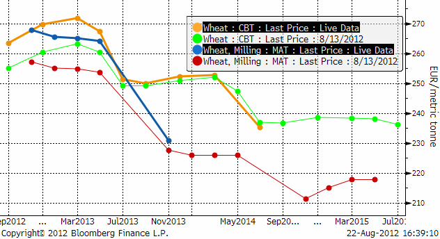 I diagrammet nedan ser vi terminspriserna framåt i tiden för Chicago och Matif och förändringen från 7 dagar sedan. Vi ser att backwardation har ökat på båda sidor av Atlanten. Priset för leverans nästa november (2013) är ca 20 euro per ton högre i Chicago än i Paris. Däremot är priset på Matif och Chicago ungefär desamma för leverans av årets skörd. Ska man prissäkra årets skörd ska man kanske tänka på att den högre korrelationen mellan prisförändringar på vårt vete och Matifs är mycket högre än med Chicagos. Ska man prissäkra nästa års skörd är det, som nästan alltid, bättre betalt när man säljer Chicago.