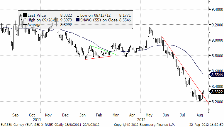 EURSEK svarar på ett starkt tekniskt stöd. Vi tror på sidledes rörelse den närmaste veckan. Den långsiktiga trenden är alltjämt nedåtriktad.