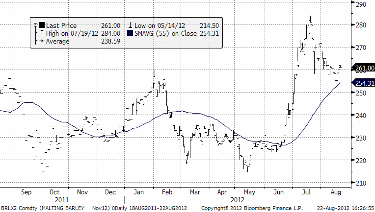 Novemberkontraktet på maltkorn steg den här veckan, helt i linje med vad vi förutspådde förra veckan, i och för sig efter att först ha hunnit rekylera ännu lite mer. Novemberkontraktet är dock netto upp 1% sedan förra veckan.
