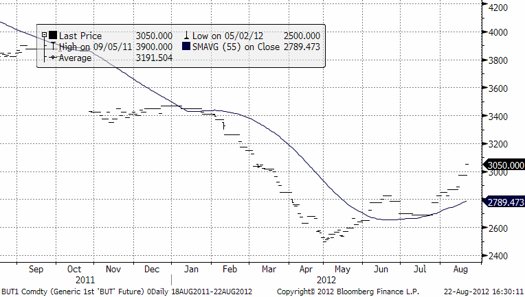 Nedan ser vi priset på smör såsom handlat på EUREX. Priset är angivet i euro per ton.