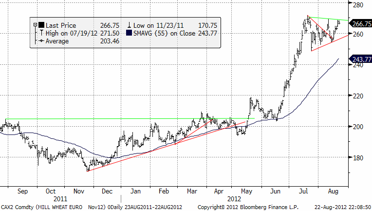 Tekniskt ser vetepriset ut att vara på väg att ”bryta uppåt”. Tekniskt talar det mesta för att priset ska fortsätta uppåt och i så fall indikerar den tekniska analysen en potential upp till 286 euro. Jag skulle helst vilja se en liten uppgång till, så att den övre delen av triangeln bröts, för att vara än mer säker.