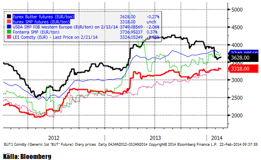 Både smör och skummjölkspulver handlades till oförändrade terminspriser, i några fall ett par procent lägre i eurotermer, jämfört med förra veckan. Eftersom euron steg mot svenska kronor med ett par procent, blev det en liten prisuppgång i svenska kronor räknat.