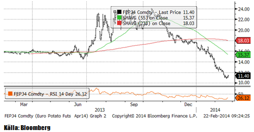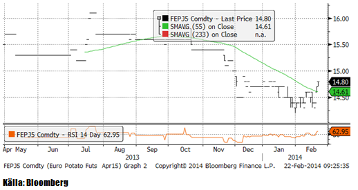 Kontraktet för den kommande skörden börjar nu handlas allt mer. Nedan ser vi kurdiagrammet för april 2015-kontraktet. Kontraktet fortsätter att handlas upp. För två veckor sedan låg det på 14.40, förra veckan på 14.50 och i fredags när börsen stängde, hade den nått 14.80 Euro per 100 Kg.