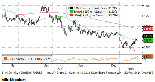 Sojabönorna handlades upp i veckan på såväl stark export från USA som hög ”crush” i USA. CONAB justerade också ner skörden i Brasilien. Trots detta har tiden i praktiken runnit ut för skador på den Brasilianska skörden. 12% är redan skördat och takten accelererar nu enligt känt mönster. Tekniskt har priset kommit upp till ”gamla bottennoteringar” från perioden augusti till december. Det gör att 1150 nu är ett starkt motstånd. Man kan vänta sig att priset får problem att gå högre och att vi istället kan få en förlängning på fredagens svaga stängning.