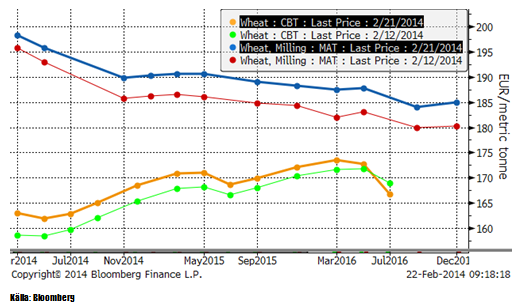 EU har överlag bra väder med nederbörd något över det normala och så väntas det fortsätta. Vi ser inte ens speciellt mycket regn över England och dess massivt översvämmade Somerset Levels. Det har nu visat sig att översvämningarna där inte beror på regnet i sig, utan på att förra Labour-regeringen och Naturvårdsverket i England, i samarbete med WWF medvetet ville skapa våtmark och därmed förbjöd den sedvanliga muddringen av floden, tog bort pumpar och började vattenfylla landet redan i höstas, trots att det inte funnits våtmark generellt där sedan 1200-talet. Översvämningskatastrofen är alltså ”man made” i miljövårdande syfte och inte representativ för resten av England eller resten av EU. Istället är höstvetet i mycket gott skick i t ex Frankrike, som fått lika mycket nederbörd. Det kan tilläggas att endast 30% av arealen i Somerset Levels odlas, resten är betesmark. Påverkan på spannmålsmarknaden är noll.