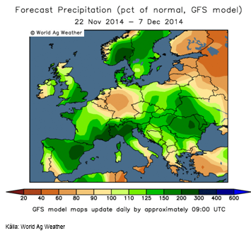 Noterbart för Europa är att Sverige och Norge får väsentligt mycket mer nederbörd än vad förra veckans prognos visade. Det påverkar elpriset negativt. Generellt sett förutspås ovanligt mycket nederbörd över Europa, utom över Benelux och Tyskland. Baltikum, Finland och Ryssland är dock torrare än normalt. Temperaturerna blir normala i hela Europa, utom i Baltikum och Ryssland där det blir några grader kallare än normalt.