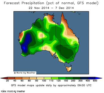 El Niño innebär också att Australien ska vara torrt, men det är det verkligen inte. Tvärtom faller i västra Australien upp till 7 gånger så mycket regn som normalt, medan den östra sidan får upp till 3 gånger så mycket som normalt. Hela kontinenten ser blötare ut än normalt. Detta är knappast bra för kvaliteten på vetet som skördas nu.