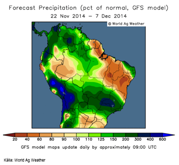 Nederbörden i Brasilien ökar från förra veckans tvåveckorsprognos. Onormalt mycket nederbörd fortsätter att förutspås för São Paulo, Minas Gerais, Goiás och Mato Grosso. I hörnet där dessa delstater möts väntas upp till fyra gånger normal nederbörd falla.