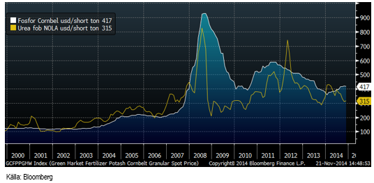 Nedan ser vi prisutvecklingen sedan år 2000 på fosfor i dollar per short ton i ’corn belt’ i USA och urea FOB New Orleans (NOLA), också i dollar per short ton. Prisutvecklingen är snarlik. Fosforpriset påverkas av att det tidigare har funnits en kartell, liknande OPEC för olja. Nu har kartellen övergått i ett oligopol. Substitut finns. Under andra världskriget utvanns den fosfor som finns i svensk järnmalm, vilket idag är något för dyrt i jämförelse med de rikare fyndigheter som finns på andra håll. Vi kan dock se att prisutvecklingen ganska väl följer prisutvecklingen på spannmål.