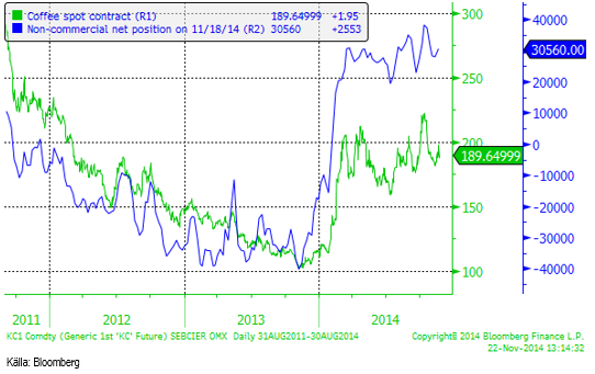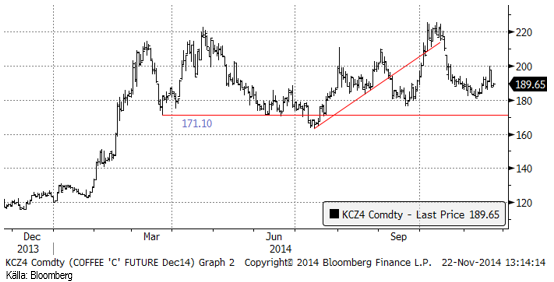 Troligen får vi återigen en vecka med ”sidledes” prisrörelse. Det finns analytiker, framstående sådana, som tror att priset kommer att gå upp kraftigt. Jag är inte alls lika säker. Dels är den ekonomiska tillväxten svagare i världen och dels regnar det mer än normalt i Sydamerika. Får vi dessutom ett El Niño är haussen historia och sannolikheten för det är ganska hög.