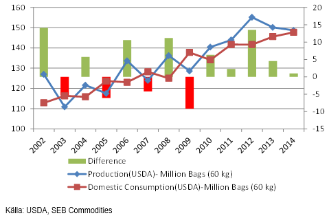 F.O. Licht skriver också att de väntar sig att global produktion blir 145.7 miljoner säckar, medan konsumtionen blir 146 miljoner. Detta är i linje med vad man kunnat förstå tidigare under året efter nedjusteringen av Brasiliens skörd efter torkan i våras.