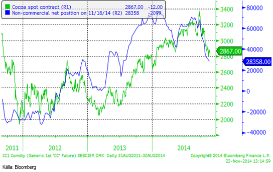 Non-commercials fortsätter sälja av terminer på kakao, förra veckan med 2100 kontrakt.