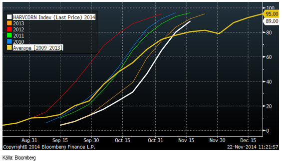 Skörden av majs accelererade enligt måndagens rapport från 80 till 89% klart. Normal takt är 80%. Skördearbetet har gått fortare mot slutet.
