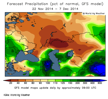 Ryssland ser i den senaste 14-dagarsprognosen fortsatt torrt ut. Nederbörden väntas ligga på mellan 40 och 60% av normal nederbörd. Västra Ukraina väntas däremot liksom i förra veckans prognos få upp till 3 gånger normal nederbörd. Temperaturen sjunker om en vecka till under det normala i Ryssland. Öster om Uralbergen sjunker temperaturen till 10 grader under det normala.