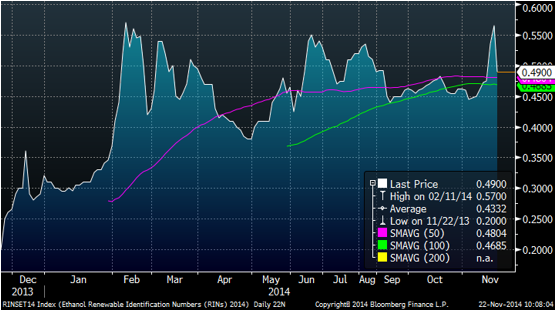 Renewable Identification Numbers (RINs) är ett slags certifikat man erhåller när man blandar en gallon av etanol i bensin. RINs kan sedan handlas som ett värdepapper, ungefär som en utsläppsrätt i EU. Priset på RINs har stigit i november, men föll ganska kraftigt i fredags från 0.57 dollar per gallon till 0.49 dollar. Prisfallet är sannolikt ett svar på den höga produktionen av etanol och farhågor om stödets vare eller inte vara.