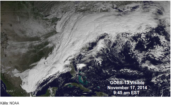 Nedan ser vi en satellitbild från GOES-13, som visar snöovädret som drog förbi tidigare i veckan. Notera att det ser ut att finnas ett snötäcke på marken väster om där snöovädret drar fram.