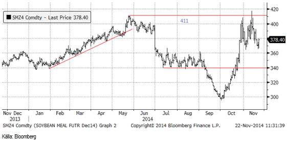 Sojamjölet utvecklades svagare än sojabönorna. Konsolideringsfasen som skett under hög volatilitet sedan slutet av oktober på mellan 370 och 420 dollar är ännu inte över. Det är oklart ur teknisk synvinkel om konsolideringen är en paus inför vidare prisuppgång eller en toppformation som följs av prisfall.