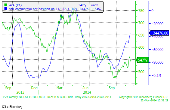 Så slutligen till vad spekulanterna gjort i Chicagovetet. Vi ser att de har köpt tillbaka ytterligare 15,457 kontrakt och nu är nettosålda 34,476 kontrakt. Vid slutet av september var de nettosålda 90,000 kontrakt.