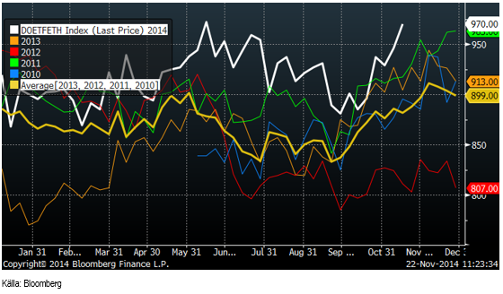 Etanolproduktionen i USA ligger på 970,000 fat per dag. Det är nästan lika högt som den rekordvecka som noterades i mitten av juni med en produktionstakt på 972,000 fat om dagen. Etanolproduktionen har hämtat sig sedan en botten i början av år 2013 på 770,000 fat per dag, då den fallit från en topp på 963,000 fat vid årsskiftet 2011/2012.