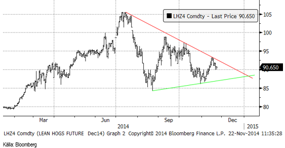 Lean hogs aprilkontrakt föll med 13% och decemberkontraktet med något mindre till 90.65 cent. Sedan i somras har svängningarna i priset blivit successivt mindre utan att priset trendat åt något håll. Detta brukar inte bli bestående, utan i regel följas av en ny trend, uppåt eller nedåt. Tumregeln är att invänta besked från marknaden och sedan haka på – uppåt eller nedåt. Det rimliga borde vara en ny fallande pristrend, eftersom PED-viruset är övervunnet.