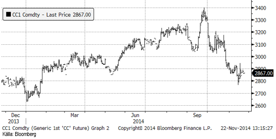 Troligen får vi återigen en vecka med ”sidledes” prisrörelse. Det finns analytiker, framstående sådana, som tror att priset kommer att gå upp kraftigt. Jag är inte alls lika säker. Dels är den ekonomiska tillväxten svagare i världen och dels regnar det mer än normalt i Sydamerika. Får vi dessutom ett El Niño är haussen historia och sannolikheten för det är ganska hög.