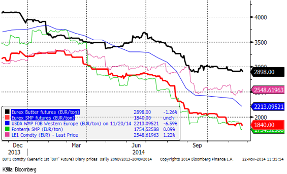 EUREX senaste index för spotpriset på smör och SMP ger med aktuell växelkurs ett produkt-värde på mjölkråvara på 2.93 kr / Kg. Den sista oktober var priset 2.99 kr / Kg. Priset har alltså sjunkit med nästan 2% på tre veckor. Ett mejeri kan inte rimligen köpa in råvaran för över tre kronor kilot, tillverka smör och SMP och sälja dessa produkter för 2.93 Kr någon längre tid. Ytterligare sänkning av avräkningspris borde vara att vänta.