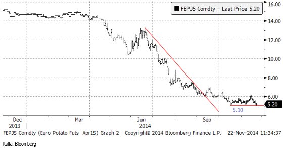 Potatisterminen sjönk med 13% (april). Priset var temporärt nere vid det tekniska stödet på 5.10 euro per 100 Kg, men stängde i fredags över den nivån på 5.20. Frågan är nu om 5.10 kommer att brytas eller hålla. Stödet har testats och hållit tre gånger de senaste två månaderna. Bryts nivån öppnar det för ytterligare prisfall, som kan bli stora i procent räknat. Om stödet håller, kan en uppgång till 6 euro ske, och till 8 euro som högst, enligt den tekniska analysen.