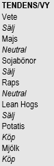 El Niño i antågande, som ger en boost åt nederbörden i Sydamerika och goda förutsättningar för odling på norra halvklotet i vår och spekulanter som redan är tämligen köpta redan gör det svårt att se positivt på prisutvecklingen. Vi fortsätter med neutral rekommendation.