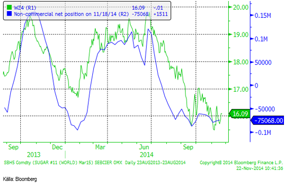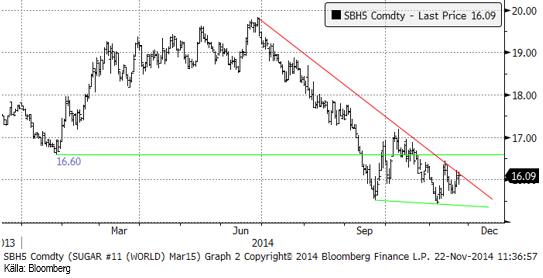 Regn i Brasilien tynger marknaden och i Uttar Pradesh i Indien börjar sockerindustrin att processa skörden av sockerrör mot slutet av månaden. Tekniskt rör sig priset inom en nedåtriktad triangelformation. Eftersom den är nedåtriktad är sannolikheten större för en prisuppgång än en nedgång när väl ett brott av triangelns ovansida eller undersida sker. Marknaden testar just nu den övre sidan och det skulle inte förvåna om det blev ett utbrott uppåt.