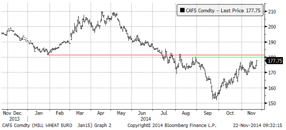 Vetepriset på Matif har segat sig upp till 177.75 euro per ton för januarileverans. Det franska vetet vinner ju exportordrar, så vetet handlas successivt upp. Strax över 180 finns ett motstånd, som marknaden borde få problem med.