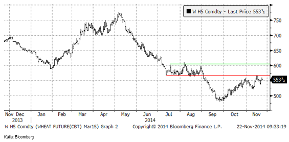 Chicagovetet (mars) har inte utvecklat sig lika positivt som Matif, men så vinner inte heller det amerikanska vetet några exportordrar. Marknaden har inte lyckats ta sig över det tekniska motstånd som begränsar uppsidan.