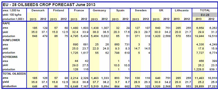 EU-Kommissionens MARS-enhet justerade i sin juni-rapport ner hektarskörden för raps och rybs 3.06 t/ha till 3.02 t/ha. Den bedöms för närvarande att bli lägre än förra året. Utsikterna för EU:s tre största producentländer Tyskland, Frankrike och Polen har försämrats. Om prognosen besannas blir det här året i så fall det fjärde året i rad för Frankrike med medioker avkastning. Även för mindre producenter som Bulgarien, Slovakien och Tjeckien görs betydande nedjusteringar (med mer än 5%).