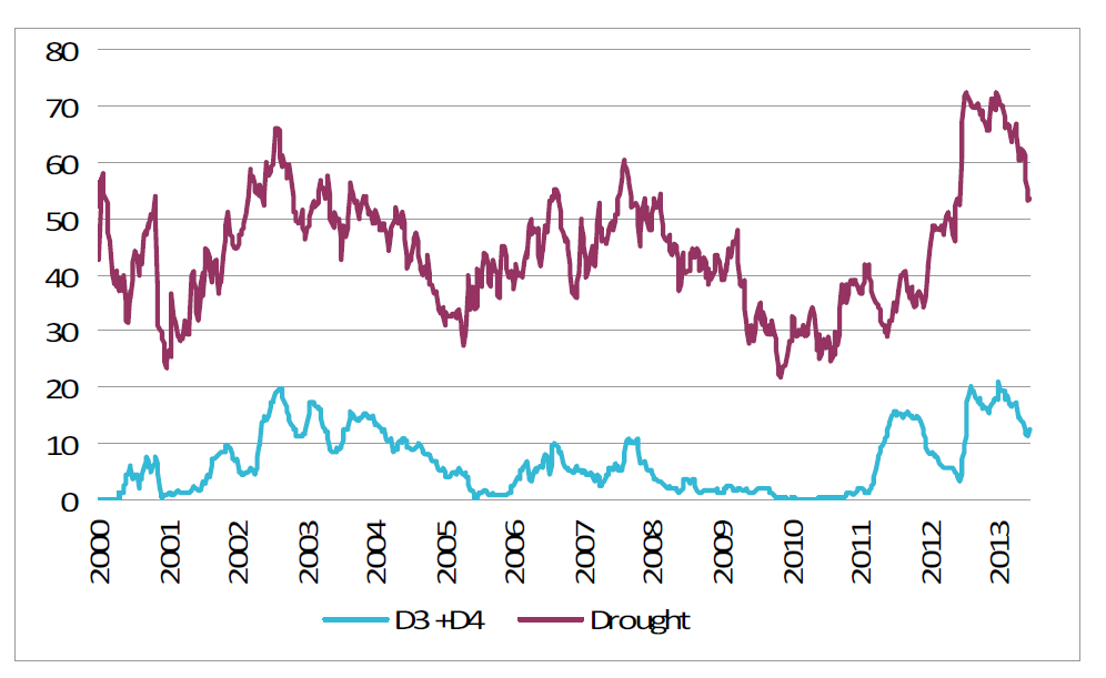 Brasilianska Safras prognosticerar att Brasiliens majsskörd hamnar på 82.7 mt. USDA estimerade i den senaste WASDE-rapporten en skörd på 77 mt (en höjning från 76 mt i maj-rapporten). USDA estimerar också att skörden i Brasilien nästa år (2013/14) blir 72 mt. Efter det fall i den brasilianska valutan de senaste månaderna finns dock anledning att tro att produktionen kan bli större än 72 mt, eftersom priset i Brasilien automatiskt har stigit med valutans fall. Se nedanstående diagram, som visar decemberkontraktet på CME uttryckt i BRL / bushel.
