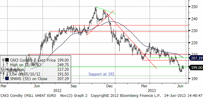 Nyheten att Kina köpt 200 kt vete från Frankrike fick prisfallet på Matifs novembertermin att stanna upp. GASC meddelade att de kommer att bjuda in till en tender före 30 juni. De har varit borta från marknaden sedan i februari. Vi betraktar rekylen upp mot 200 euro som just en rekyl mot trenden och att prisfallet fortsätter.