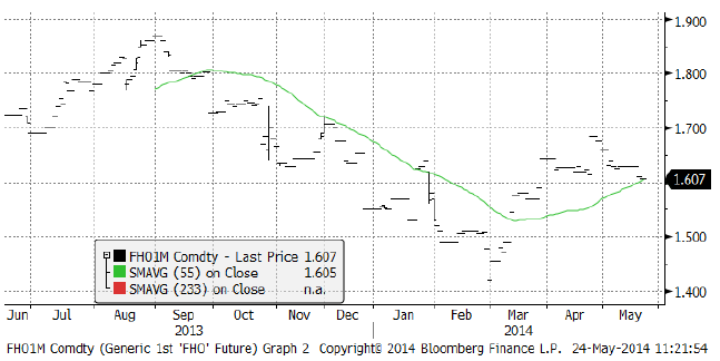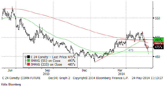 Sådden av majs går framåt i USA och är nu nästan färdig. Ukrainas produktion av majs ser ut att bli ungefär lika stor som förra året enligt de uppgifter som publicerats i veckan. Prisuppgången på spannmål tidigare i år motiverades av oro för Ukrainas produktion, där gissningarna låg på 20 – 25 mt. Nu ser produktionen ut att hamna kring 30 mt, exkl Krim, alltså i nivå med förra året. I skrivande stund har det inte kommit några alarmerande uppgifter om våldsamheter från presidentvalets Ukraina idag.