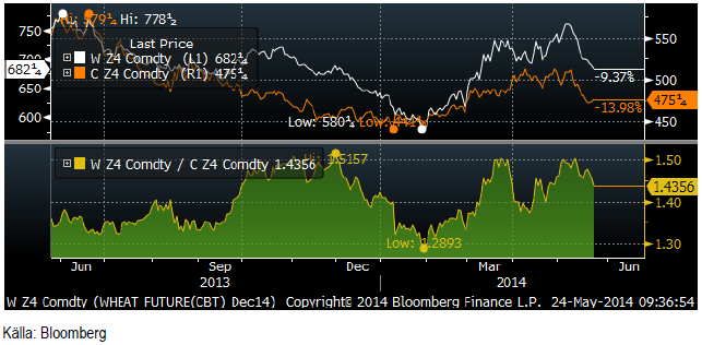 Den senaste tiden har priset på vete fallit mer än priset på majs, trots att utbuds- och efterfrågebalansen ser mer negativ ut för priset på majs än för vete. Fallhöjden är större på majs än på vete. Vi ser att kvoten mellan terminspriserna på majs och vete gått från 1.5 till 1.44. Terminerna på majs ”borde” falla mer än veteterminerna och kanske gör det nu.