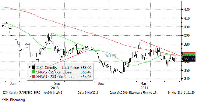 Novemberkontraktet på Matif fick lite stöd av uppgången i sojabönorna, men stötte på säljare vid 366 euro. Tekniskt ser marknaden svag ut. Som nämnt förefaller marknaden ha en stark övertygelse om att den absoluta botten ligger vid 350 euro per ton. Besvikelsen kan bli stor om priset faller under den nivån. Den indiska monsunen är några dagar sen, vilket är ett observandum. Det kan ha att göra med El Niño och ett sådant kan påverka monsunen negativt, med lägre skörd av rapsfrö som följd.