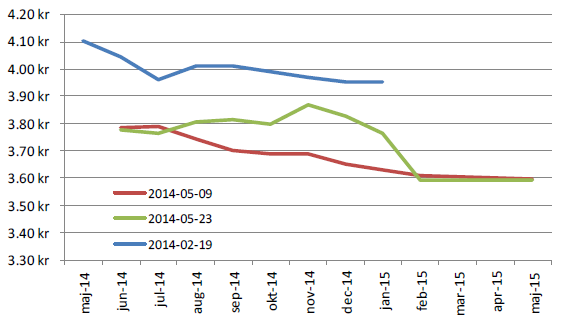 Terminspriserna på EUREX steg även den här veckan, till slut. Genomsnittspriset för de kommande 12 månadernas terminer steg från 3.70 kr till 3.72 kr per kilo. Mitt i veckan var priserna upp till 5 öre lägre än de slutade på. Från att ha varit lägre terminspriser ju längre fram i tiden förfallet ligger för terminerna, har detta vänt den senaste tiden. Terminsmarknaden förväntar sig högre spotpris på SMP och smör under hösten. Om detta faktiskt besannas återstår att se. Det finns i vart fall utrymme för besvikelser nu. Som vanligt vill vi påminna om att SEB ”bättrar” börsens köpkurs med 1% i detta inledningsskede av börshandeln. Det innebär alltså ett snitt pris för de kommande 12 månaderna (inklusive maj 2014), går att sälja på 3.76 kr / Kg basis SMP och smör.
